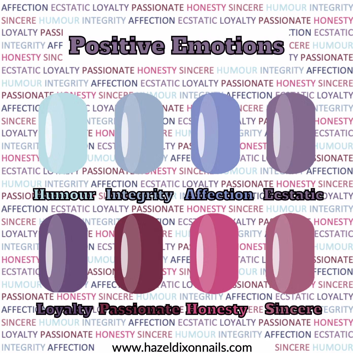Positive Emotions - är en serie färger som ger ro och harmoni. Populär färg är Affection som är en gråblålila färg med mikroglitter i guld, mycket snygg! Välj din favoritfärg i menyn. OBS! Alla 10 tipparna blir i samma färg.